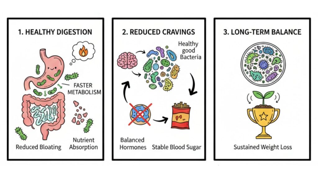 Instead of forcing weight loss, probiotics create an environment where your body wants to be at a healthy weight. They bridge the gap between “trying to diet” and actually seeing results by fixing your internal chemistry. Here is how they naturally support your progress over time: