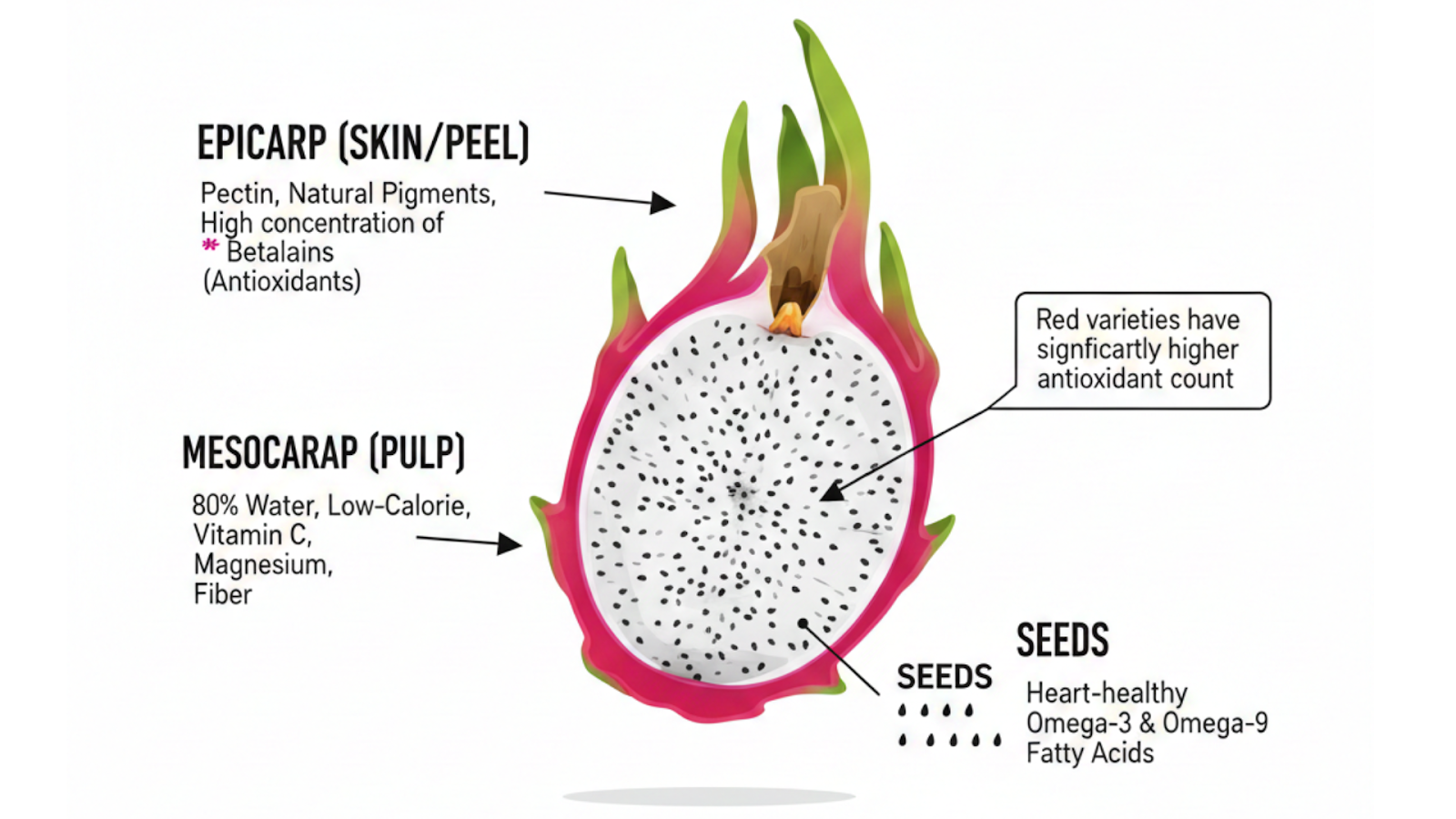 The most striking difference lies in the antioxidant capacity. The deep crimson or pink dragon fruit flesh is saturated with betacyanins, a specific class of antioxidants not found in the white variety.